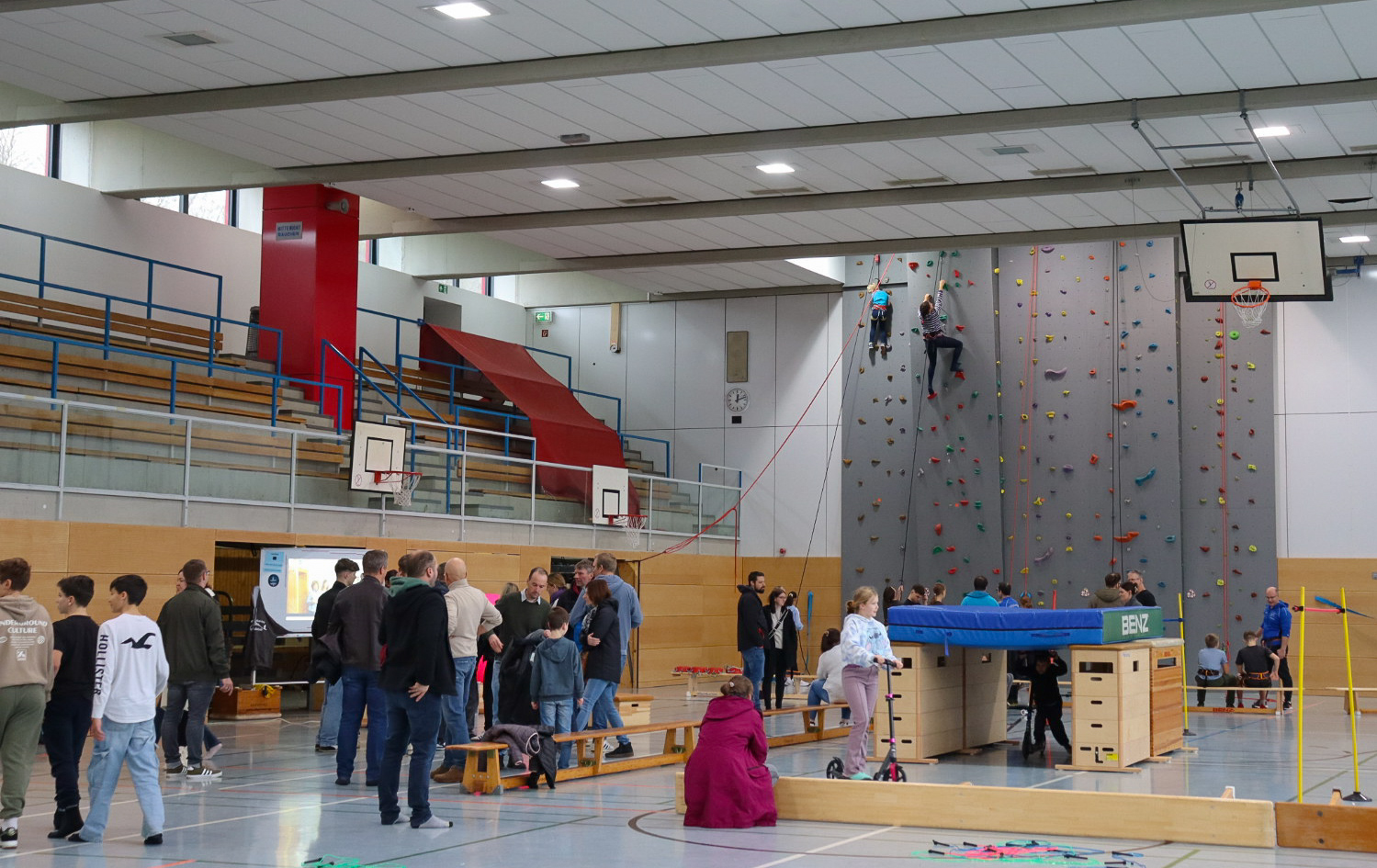 Die Weiltalschule Weilmünster ist darauf eingerichtet, Kinder unterschiedlicher Begabungen passend zu fördern. Individuelle Lernzeiten und eine neu konzeptionierte Begabtenförderung begleiten Kinder mit Schwierigkeiten genauso wie Kinder mit besonderen Begabungen. Schülerinnen und Schüler und ihre Lehrerinnen und Lehrer illustrierten die Vielfalt mit Mitmachangeboten aus den Bereichen der Fremdsprachen, Gesellschaftswissenschaften, Naturwissenschaften, der Mensa, der Mathematik, Kunst, Musik, des Internets und der IT, es wurde mikroskopiert, experimentiert, gerechnet, gebacken, gewerkelt und gebastelt. Das sozialpädagogische Team stellte sich und das Konzept der täglichen „Sprechstunde“ vor, die Schülerinnen und Schüler auf eigenen Wunsch zur Besprechung ihrer persönlichen Anliegen nutzen können. Ergänzend dazu wurde die Arbeit des Schulbegleithunds Ludwig vorgestellt. Selbstverständlich gab es die Möglichkeit, sich bei sportlichen Aktivitäten und an der Kletterwand oder auf dem Großtrampolin in der Sporthalle auszutoben und sich mit dem herzhaften Kioskangebot oder Kaffee und Kuchen oder Kinderpunsch und frisch gebackenen Waffeln zu stärken. Da in der Weiltalschule das Mittagessen täglich frisch von Schülergruppen für die Schulgemeinde zubereitet wird, konnten die Besucherinnen und Besucher erfahren, dass es immer, nicht nur am Tag der offenen Tür, im Schulgebäude lecker duftet. Ballett- und Musikvorführungen und das Angebot einer offenen Musikprobe vervollständigten das bunte Bild – und es waren alle eingeladen, selbst aktiv mitzumachen.