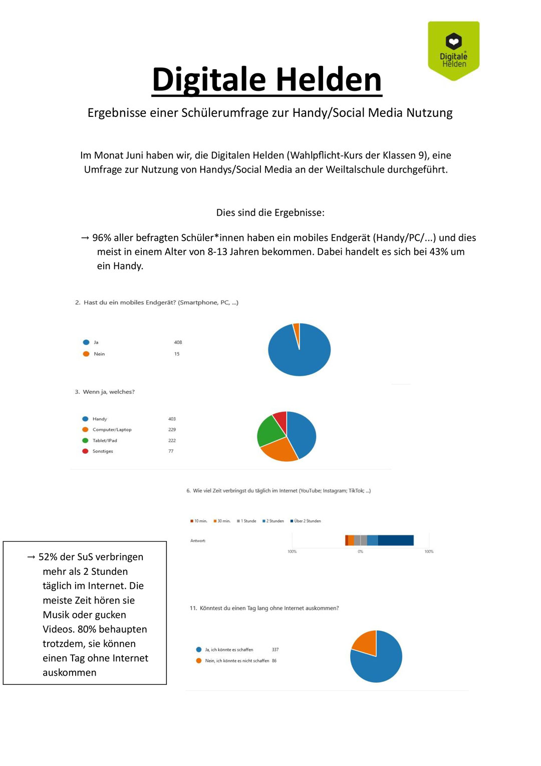 Konkret wurde in der Umfrage gefragt, ob die Schülerinnen und Schüler z.B ein mobiles Endgerät o.Ä. besitzen, wieviel Zeit sie täglich im Internet verbringen (YouTube, Instagram, TikTok,..) oder auch ob sie einen Tag ohne Internet auskommen würden.