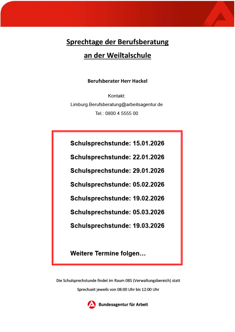 Überblick über die Sprechstunden der Agentur für Arbeit an der Weiltalschule. Klicken Sie bitte auf das Bild, um die Termine gößer anzuzeigen.